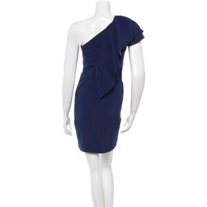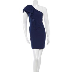 Navy blue Maje one-shoulder mini dress featuring ruffle accent throughout and concealed zip closure at side.