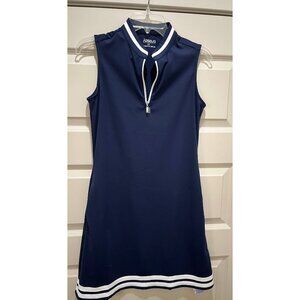 From our Navycore collection. This dress embodies "elegant sporty aesthetics," seamlessly blending the sophistication of golf with the practicality of everyday wear. Navy blue, as the primary color, conveys a sense of confidence and timeless style, while white accents add a fresh, vibrant contrast. The striking color-blocking ensures a polished look for the course while maintaining feminine grace.