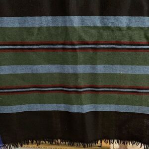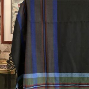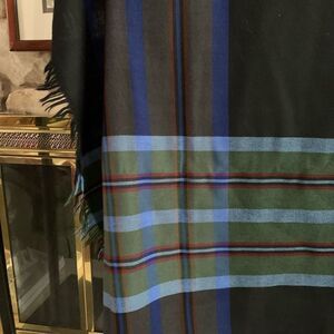 Gently worn navy plaid wrap with fringe.