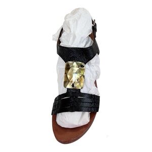 Naya Arnelli black leather sandals with shell detail. Buckle closure. 3/4” platform. 4” heel. Leather uppers. Balance man made material.