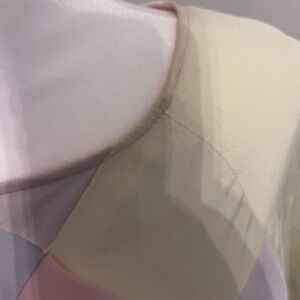 Stylish crossover shirt with pink, green, and purple diamond pattern. Perfect for a chic look. Needs a good cleaning as shown in pictures.