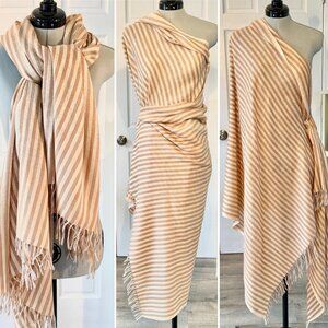 Nazakat 100% Pure Wool Beige and White Striped Shawl with Paisley Detail