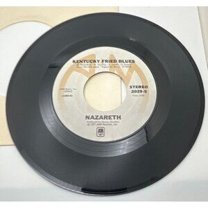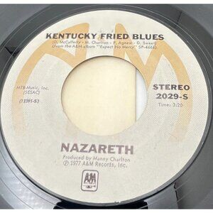 A 1977 7-inch vinyl record featuring Nazareth's tracks "Kentucky Fried Blues" and "Gone Dead Train," produced by Manny Charlton, in a protective sleeve.