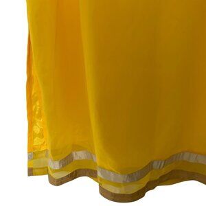This is a brand new Nazila Couture kurta, size large. This top is new without tags (NWOT). The vibrant yellow tunic features an intricate, hand-beaded applique created from beads and crystals around the neckline, adding a touch of elegance and detail. The top is fully lined for comfort and has side slits, measuring approximately 17 inches up from the hem, which allows for ease of movement and a flattering fit. Bands of silver and gold fabric trim the sleeves and hem. This piece can be worn as a standalone top or styled as a traditional kurta with pants. It's a perfect choice for special events, parties, or adding a pop of color to your everyday style.