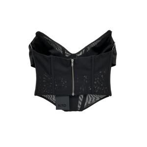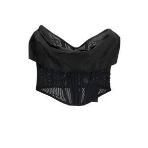 Nbd 'Hailee' Black Polyester Bustier Top Size XS: exposed back zipper closure, boned bodice, mesh fabric with draped bust overlay, measurements: 11 inch bust width x 13 inch full length.