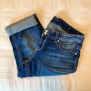 Nearly New (Only Worn Twice) Vigoss The Dallas Embroidery Capri Jeans. Women's Size 18 (See Tag in Pic). Waist: 19,” Hip: 23,” Inseam: 17.5 (Rolled Up) and 21 (Unrolled),” Total Length: 28” (Rolled Up), and 31.5" (Unrolled). These jean capris are 98% Cotton/2% Spandex. Machine Wash/Tumble Dry. These naturally worn-in whisker-washed jean capris feature distinctive embroidery and crystals, leather, and heavy stitching detailing on and around the pockets for a look with Western flair. They feature six functional pockets with a cute triangle functional pocket above the left front pocket (see the 5th picture), crystal two-button closure with zip fly, faded wash, signature "v" in back, asymmetrical belt loops, and silver back logo patch. No rips, stains or pulls. From a smoke-free home. Message with questions.