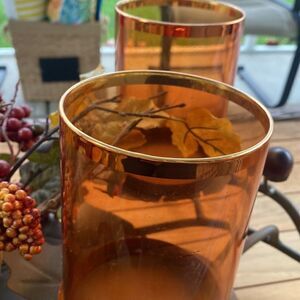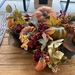Natural looking berry, gourd, leaf and pumpkin arrangement mounted on a metal branch with leaves holding 2 glass candleholders. In VGUC.