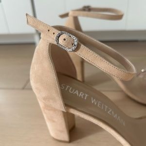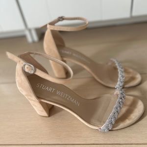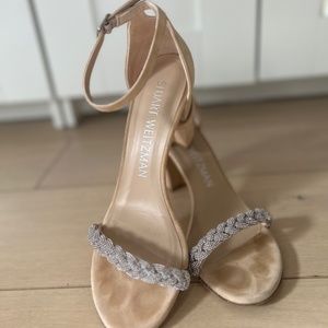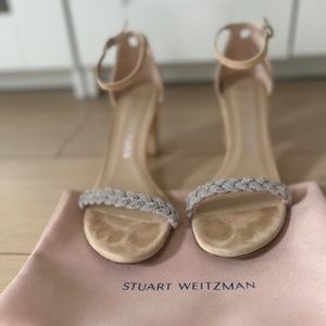 These Stuart Weitzman sandals are absolutely stunning and perfect for wedding season! I wore them to a single wedding, so they are in like-new condition with absolutely no scuffs anywhere. They come with the shoe bag and original box. The heel height is 3 inches and they are size 9.5. They fit true to size.
