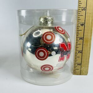 Keywords: Nebraska Cornhuskers, Huskers, Bullseye, Glass Ornament, Ball Ornament, Football, NCAA, College Football, Fan Gear, Collectible, Holiday Decor, Christmas Ornament, Go Big Red