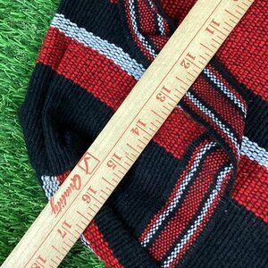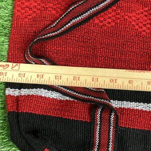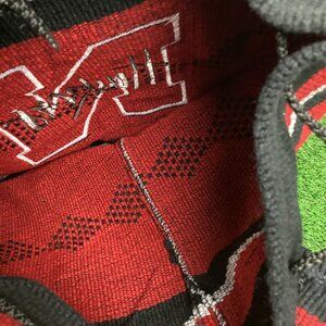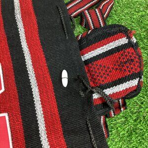 Drawstring with a loop hook closure. Two straps (not adjustable). Has a flexible canvas type fabric. Good used condition.