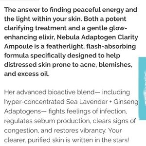 The answer to finding peaceful energy and the light within your skin. Both a potent clarifying treatment and a gentle glow-enhancing elixir, Nebula Adaptogen Clarity Ampoule is a featherlight, flash-absorbing formula specifically designed to help distressed skin prone to acne, blemishes, and excess oil.