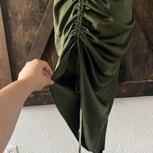 Neck Ruched Drawstring Knot Asymmetrical Satin Cami high thigh slit Dress