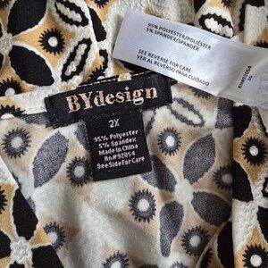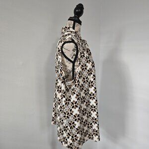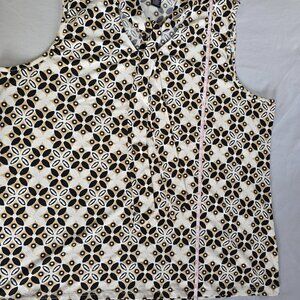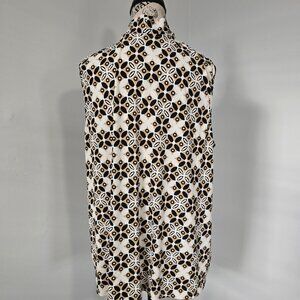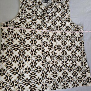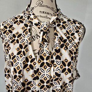 Sleeveless blouse with a geometrical floral pattern in tan, white and black. There is a tie on the neckline that you can tie as a bow or a classic necktie. Paired with a black or other colored cardigan and this is a very classy look. Great for the office!