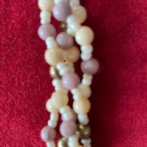 Necklace. 28” long. Metal, seed acrylic beads, neutral colors