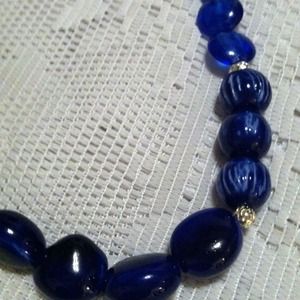 Blue crystals and lamp work beads with silver accents. 18 inches long