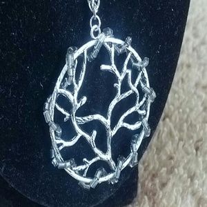Silvertone metal chain, tree pendant with silver seed beading. Hand made.