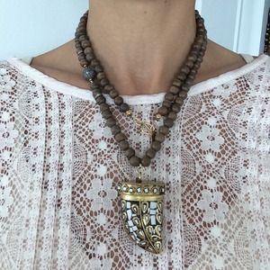 40" African wood beed necklace with 10mm diamond ball Tibetan Horn and pyrite accents. Wear it single or double. The Horn can be removable!!! True Stunner!!! Prices in these pictures vary the white one has more diamonds retail $1200!!!!