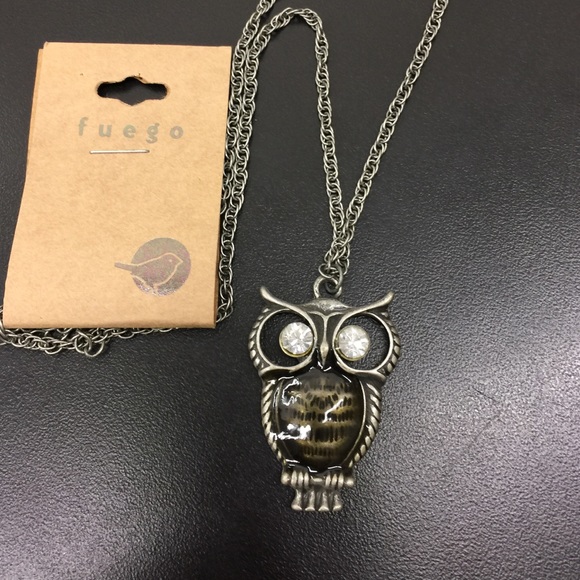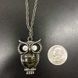 Rustic looking Owl with rhinestone eyes on an adjustable silver chain.