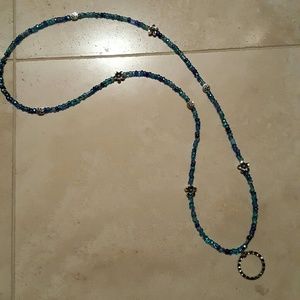 Peeper keeper necklace. Blue beads with silver Flowers. 14" long.