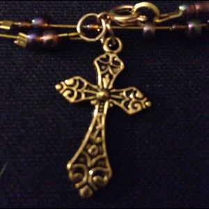 Long necklace good plate cross .Brown glass beads . Handmade by Kalgirl Inc
