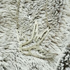 Silver necklace (costume jewelry) of a bird with engravings.