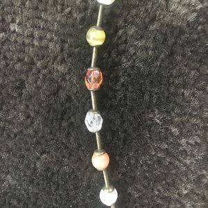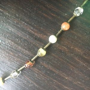 Brassy look finish chocker style necklace. Beads separated by decorative brass colored tubes. Some opaque, and some clear beads. Delicate looking not overpowering casual necklace.
