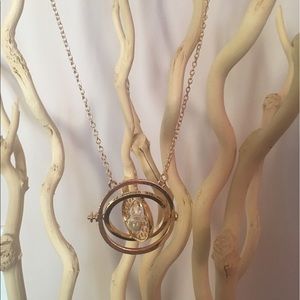 @alloyjewelry hi. This is yellow gold plated. It's a Harry Potter theme( Hermione's time turner hourglass from The Prisoner of Azkaban). It says: " I mark the hours every one nor have I yet outrun the sun. Unto you are gauged by what you have to do my use and value"
