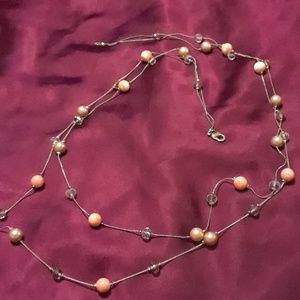 Two strand necklace. Peach colored...crystal colored ..and pearl colored balls on the necklace.