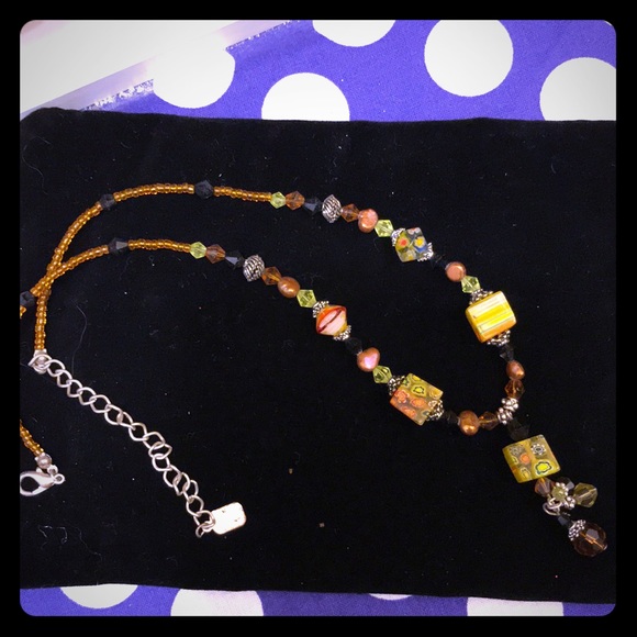 Short 16” necklace with small beads and 3 large cube shaped beads. Goes well with brown or yellow