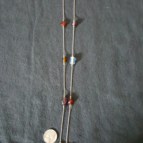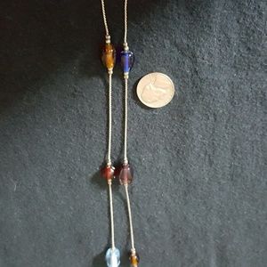 A beautiful silver in color longer chain .with just the amout of glass beads tomake it elegant.