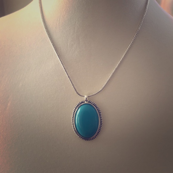 Fashion silvertone necklace with turquoise colored pendant, nice weight. Chain is 15” can expand to 18” a pendant measures 1.5” - open to bundling jewelry purchases 😁