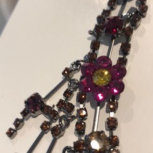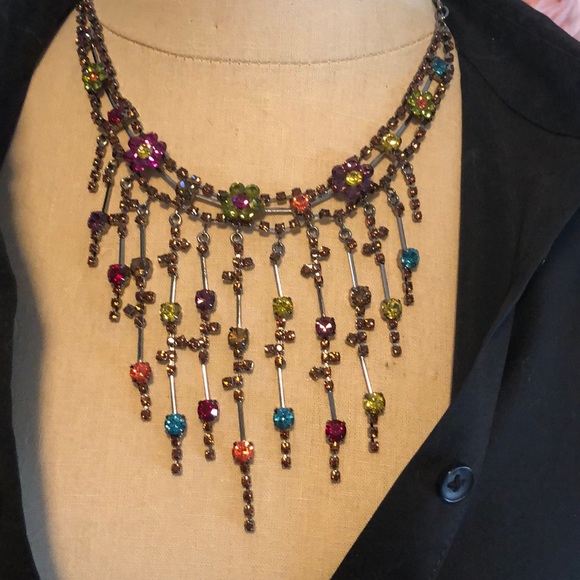 Very unique! Turquoise, green, purple, red, yellow, orange, and copper crystals in pewter toned setting. Very eye catching, and fun. Excellent condition!