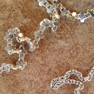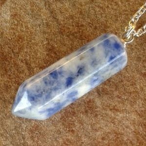 Double chain necklace with a blue and grey mingled crystal and royal blue sea glass beads.