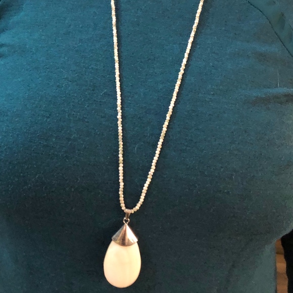 Faceted Czech glass bead chain. Pearlized stone with sterling plated bail. 15" length with 2 1/4" dangle. Can be worn casual or dressy. Very versatile.
