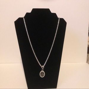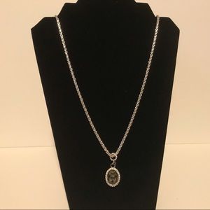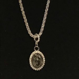 This necklace is long enough that you could probably warp it around to wear as a choker. It is not sterling silver and measures 32 inches long. Has a crystal stone at center with more crystal accent around the larger stone. It is a lovely necklace.💎 earrings not include it.