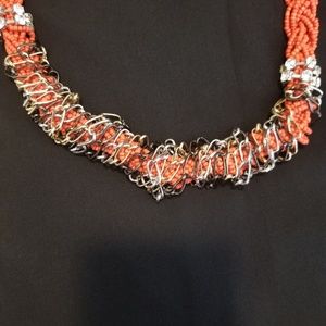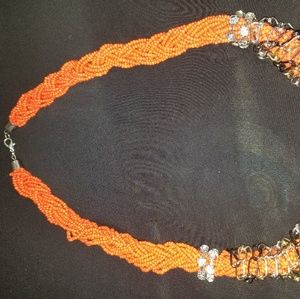 Orange beaded, with black and silver chains. With rhinestone embellishments.
