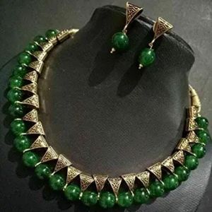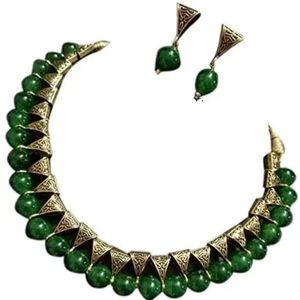 Saraa Dazzling Oxidized Polish Metal Green Coloured Pearl Jewellery Set For Women/Girls (Green, Oxidized Gold)