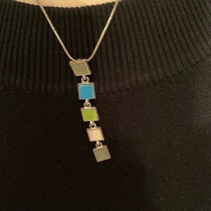 Silver tone necklace featuring 5 squares in blue and green colors.