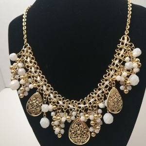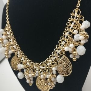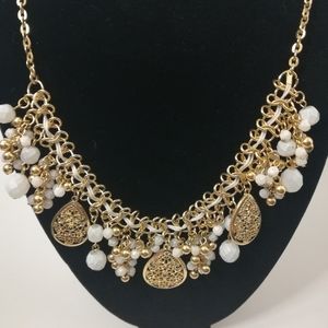 Costume jewelry necklace with white beads and dangling embalming. In great condition, has no missing pieces. Adjustable chain in back for various sizes. Worn 1 time, comes from smoke free home