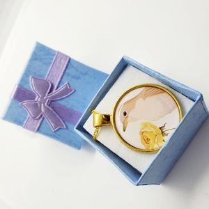 This gold pendant features a tiny bird peeking out with a small yellow rose by it's side. Crafted by hand with a reain epoxy mix it is as lightweight as they come! A dainty pearl compliments the pendant perfectly!