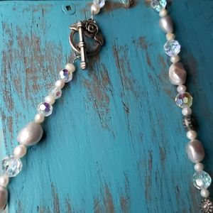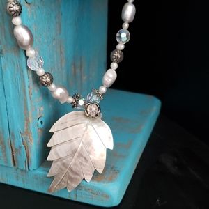 Very pretty necklace with delicate mother of pearl and silver look beads and leaf accent. Beautiful rose design on the closure. About 22 inches long.