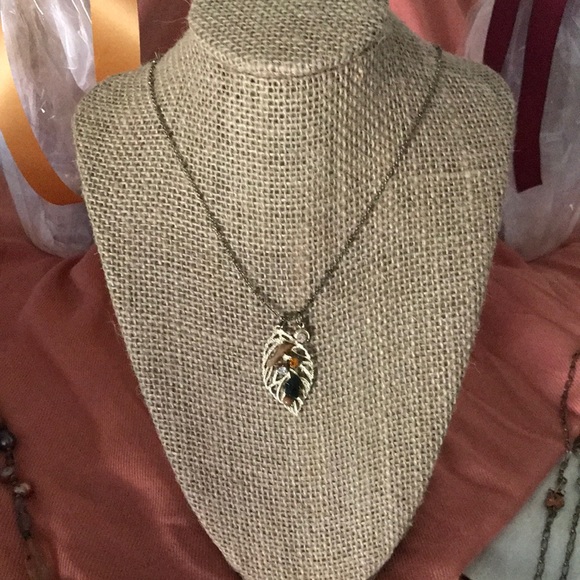 Darling leaf necklace w/rhinestone embellishments, fun to wear, lightweight, costume...lots of wear left
