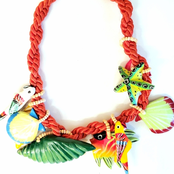 Vacation-ready! Put a tropical spin on your look with this vintage braided necklace, enhanced with island-inspired wooden birds & shells. #vintage #retro #vibes #necklace