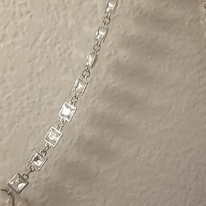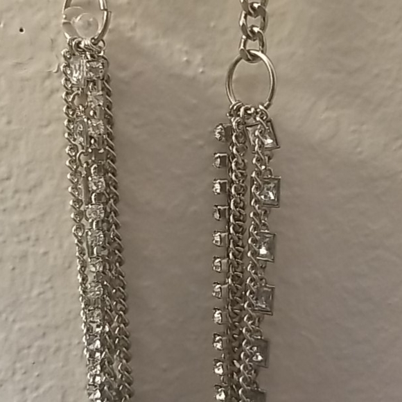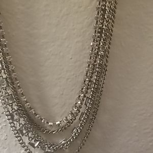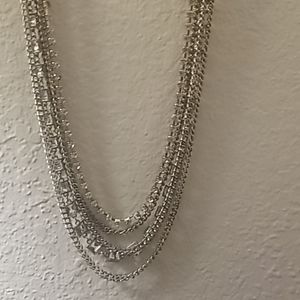 Long silver necklace, with large and small Rhinestones. It has 5 layers.