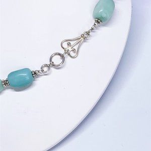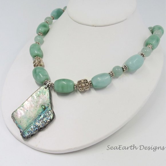 This beautiful necklace is truly stunning and is made with natural abalone, large new jade beads, 10mm aventurine beads, sterling silver Bali beads and clasp. It is 18" in length. .