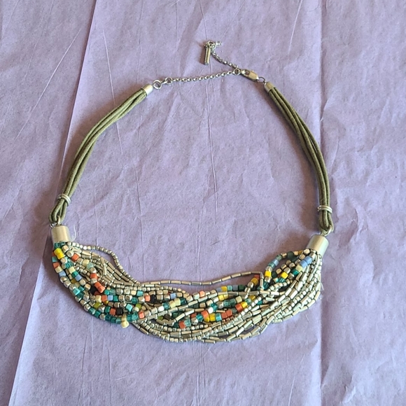 This collar necklace is the casual piece your wardrobe needs! With olive green Robin that connects to many strands of silver beads accented with small beads in many colors. Lobster claw closure.