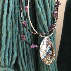 Three strands of beads and large shell-like piece in the center.
