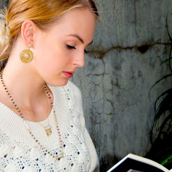 Love the color spectrum in this necklace! 24" 14 karat gold plated sterling silver multi color tourmaline wired beads in 3.5mm x 4mm. Accented with three bezel set cultured freshwater stick pearls in approximately 5mm x 25mm - pearls will vary in size with each piece. Lobster clasp closure. Layer with other similar necklaces as shown in photo and listings.
