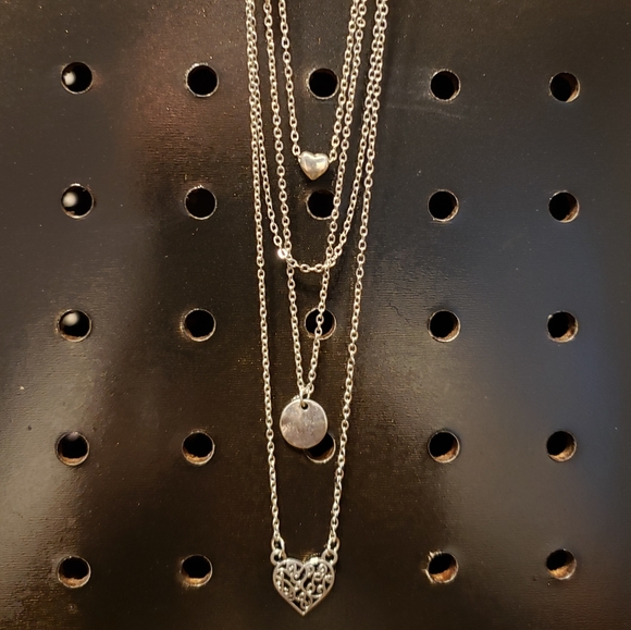 Shimmery silver layers cascade below the collar. Infused with hints of shiny white beading, dainty silver hearts and delicately hammered silver disc swing swing from the bottom of the chains.