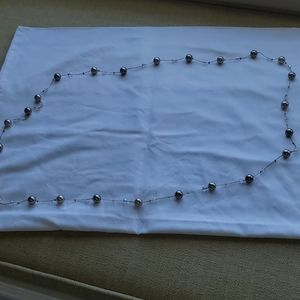 Pearl necklace in shades of taupe and gray metallic accented by crystal beads and gold tone hardware